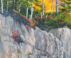 Vienot moved from Northwest Florida to Downeast Maine in October of 2022, with the intention of painting the rocky coastline. Her first challenge was to learn how to paint rocks, since there were almost none in Northwest Florida. With plentiful inspiration just minutes away from her home in Trenton, Joan spent most of her first winter hiking the trails and driving the roads of Mt. Desert Island and the Schoodic Peninsula, exploring, sketching, and taking notes. She had vacationed in Maine, New Hampshire, and Nova Scotia, but everything seemed new and more exciting now that she was on a mission. An avid plein air painter, Joan returned to many of her favorite places when the weather warmed, palette and canvas in hand. It didn’t take long to make the acquaintance of other plein air painters in the area, who introduced her to even more scenes to paint. She says that she tries to prioritize the rocky coastline, but she also is captivated by interior Maine landscapes. She counts it a win if her landscapes include at least one rock or rocky structure, a challenge easily met since this is Maine. Her exhibit includes scenes from Cape Elizabeth, Bristol, Port Clyde, Monhegan Island, Owl’s Head, Blue Hill Peninsula, Mt. Desert Island and Acadia National Park, Sullivan, Franklin, Sorrento, the Schoodic Peninsula, and Gouldsboro.